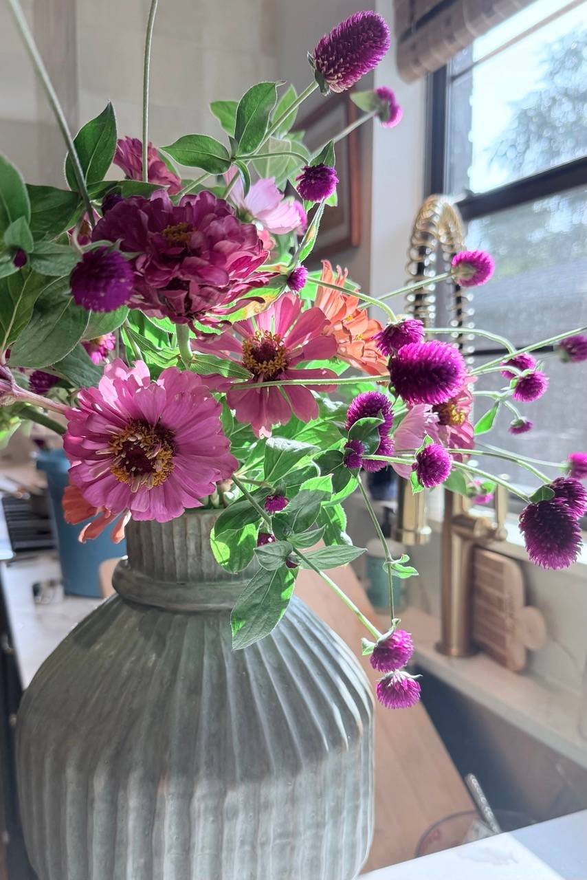 Assorted zinnias and gomphrena 'Audray Purple-Red'.