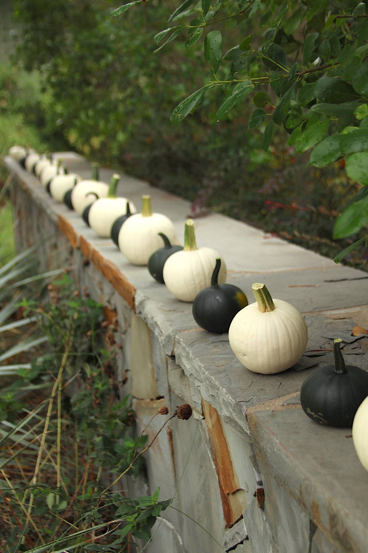 I have yet to find a tabletop-size orange pumpkin that I like, but I am pleased as punch to have found my go-to black and white pumpkins. I grew 'Black Bear' for the first time last year, and this year I had success with 'Shiver', a 1.5-2.5 pound white pumpkin. 'Shiver' and 'Black Bear' (both available from Johnny's Seeds) are semibush pumpkins that grow more like zucchini. Both have a resistance to powdery mildew and neither suffered from squash vine borer damage thanks to early season covering with insect mesh and a few preventative sprayings of organic Bacillus thurengiensis.